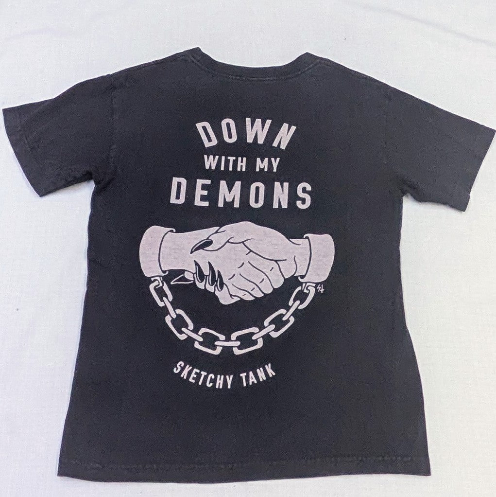 Embrace your inner darkness with our Down with my Demons tee. This black tee features a sketchy tank design with the phrase "down with my demons" on both the front and back. In good used condition