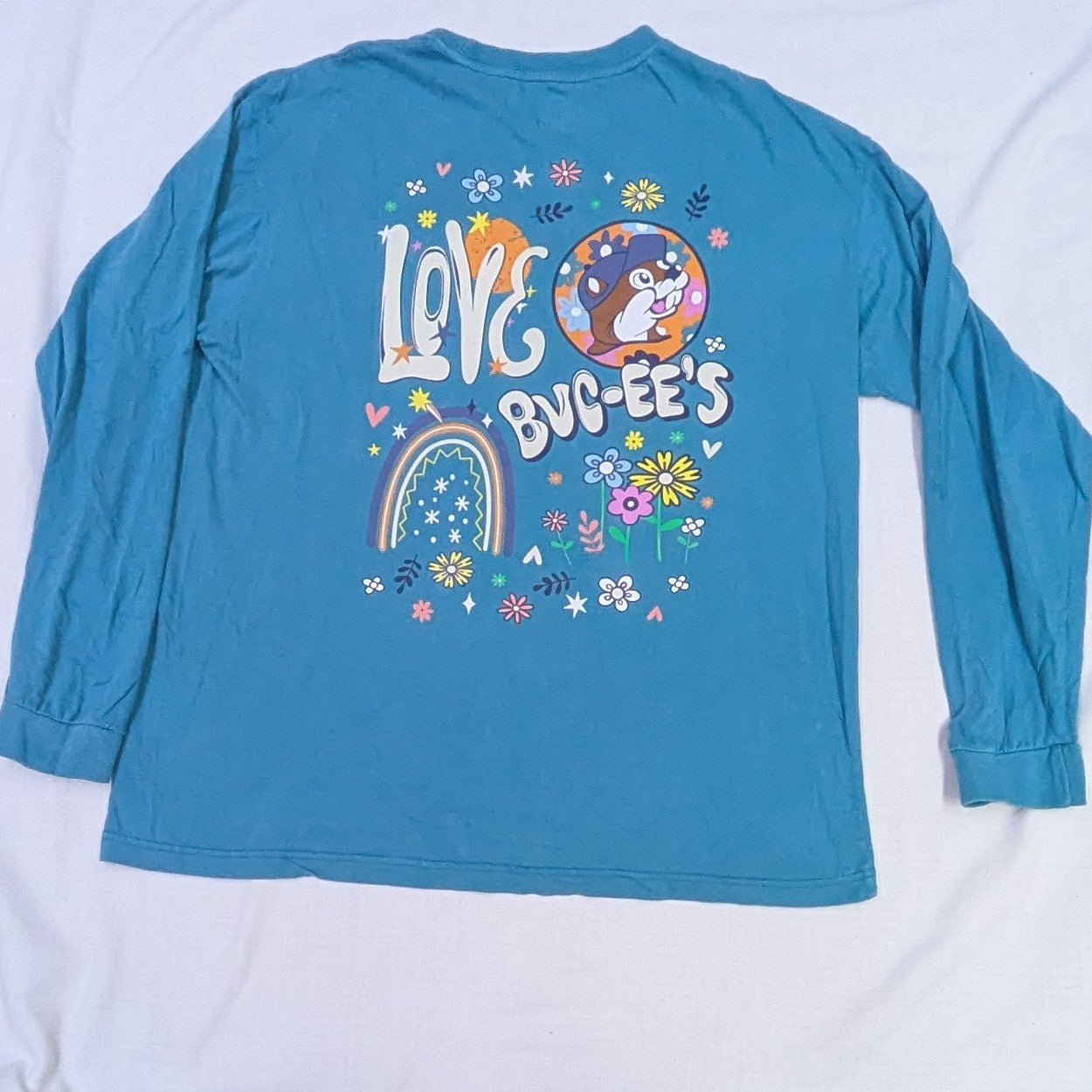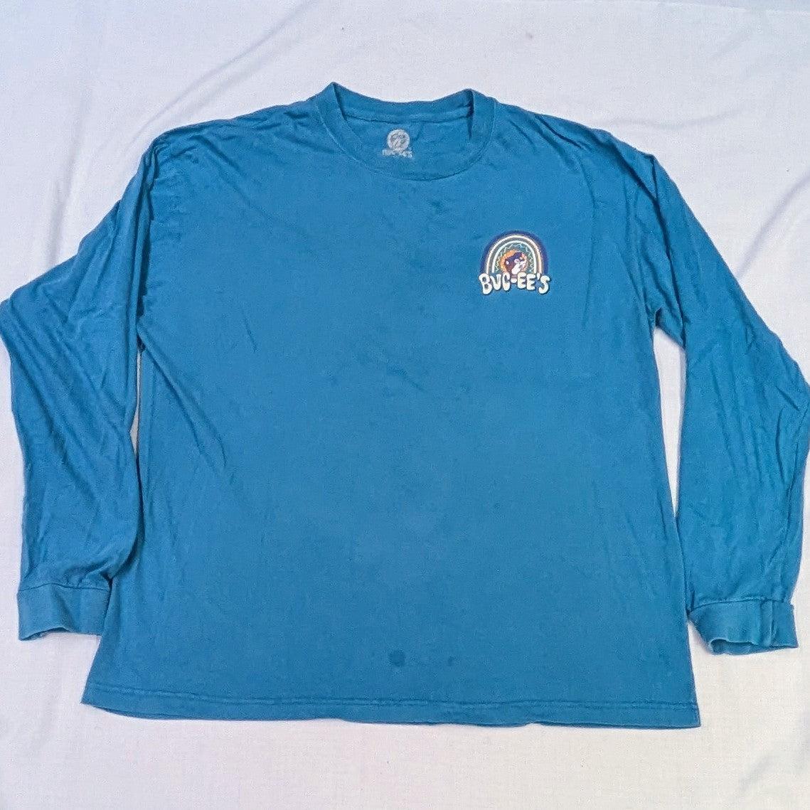 Blue long sleeve graphic tee with "Love Bucees" design. a couple grease spots on the front but they should wash out.