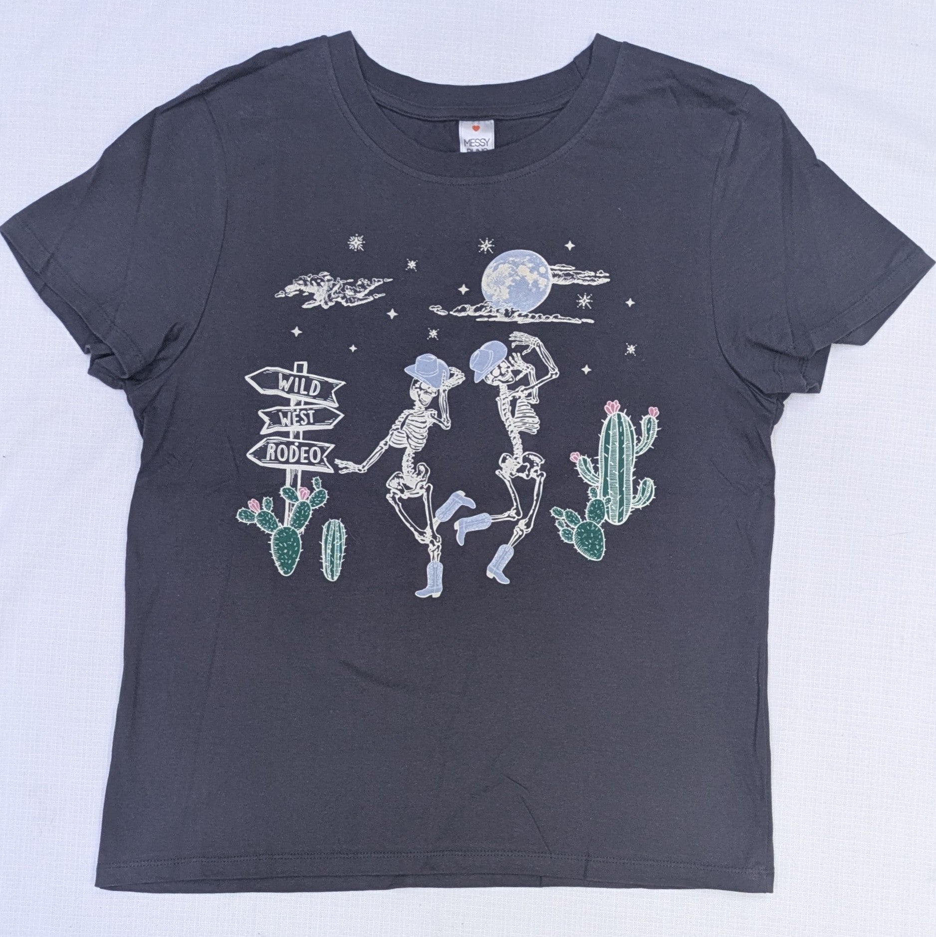 Saddle up with this quirky Grey Wild West Rodeo skeleton cotton tee. Show off your bone-tastic style while staying comfortable in this soft cotton tee. Perfect for any rodeo or country music lover. Giddy up!