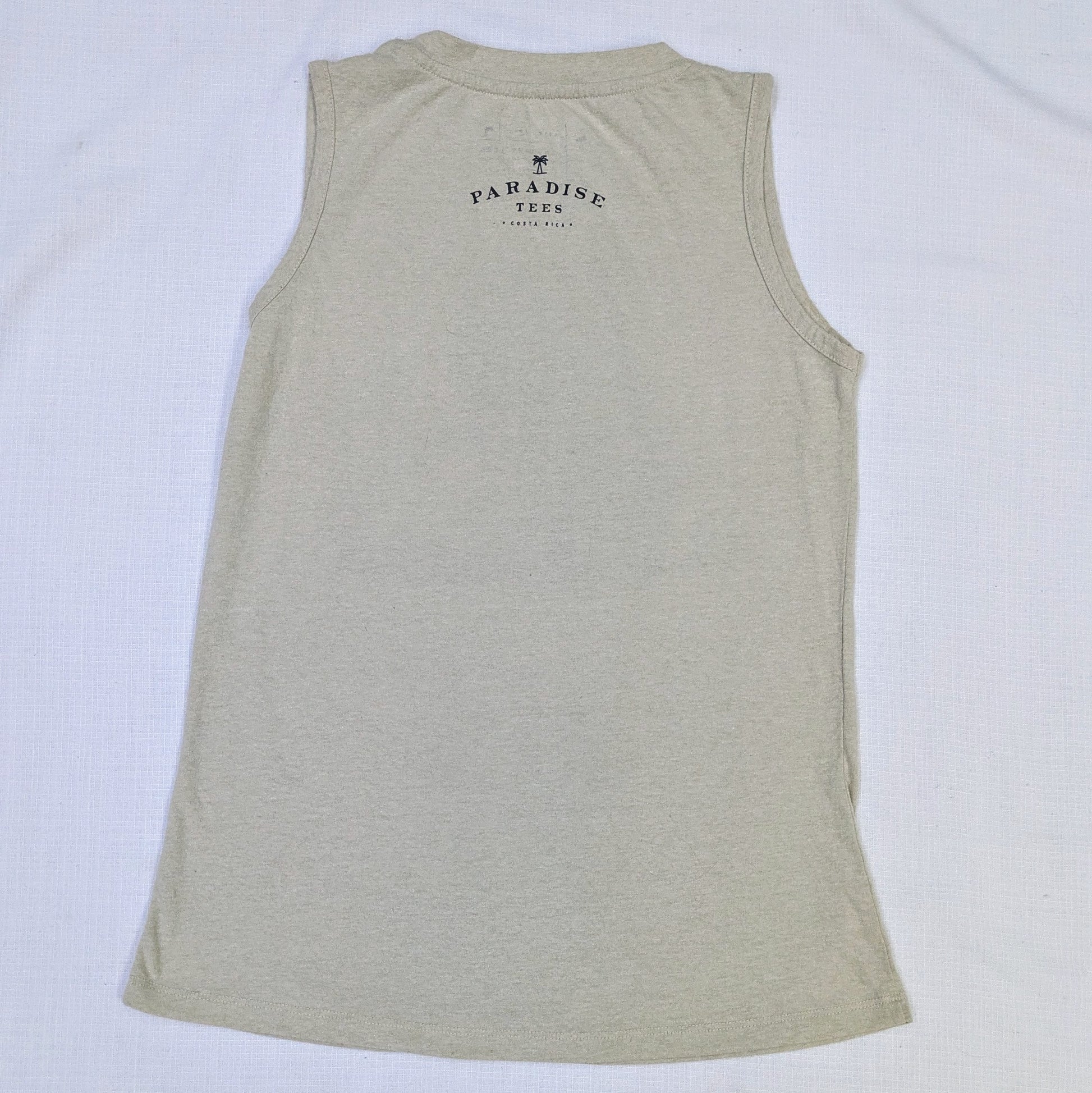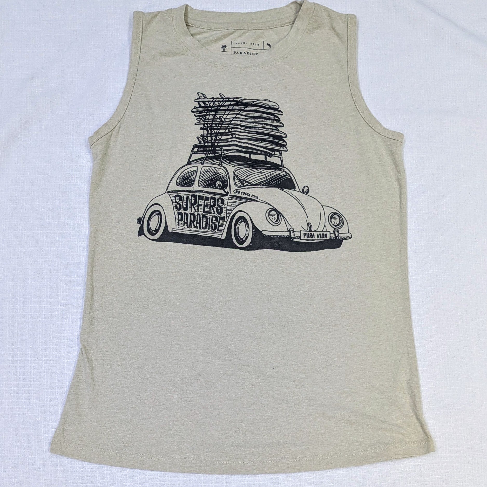 Ride the waves in style with this tan sleeveless tank top featuring a Surfers Paradise graphic. Perfect for a day at the beach or a casual summer look. Make a splash with this playful top.