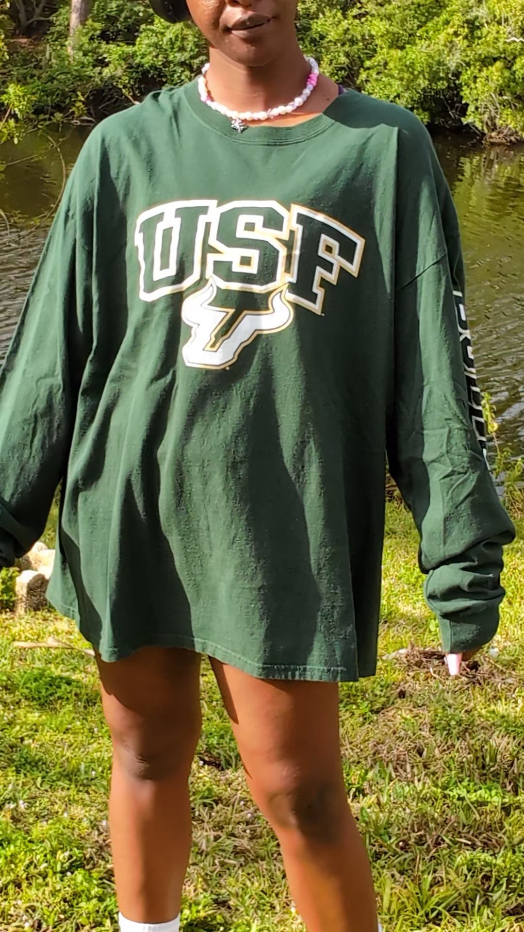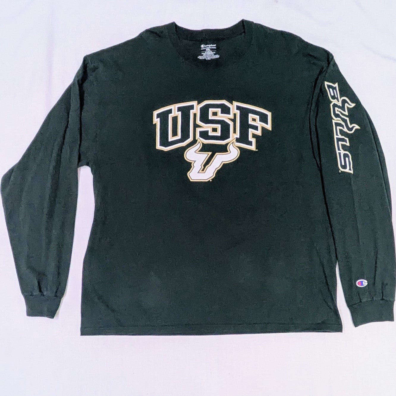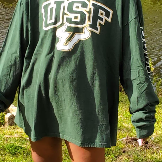 Long sleeve green Champion tee with large bold USF logos on the front and back. Size XXL