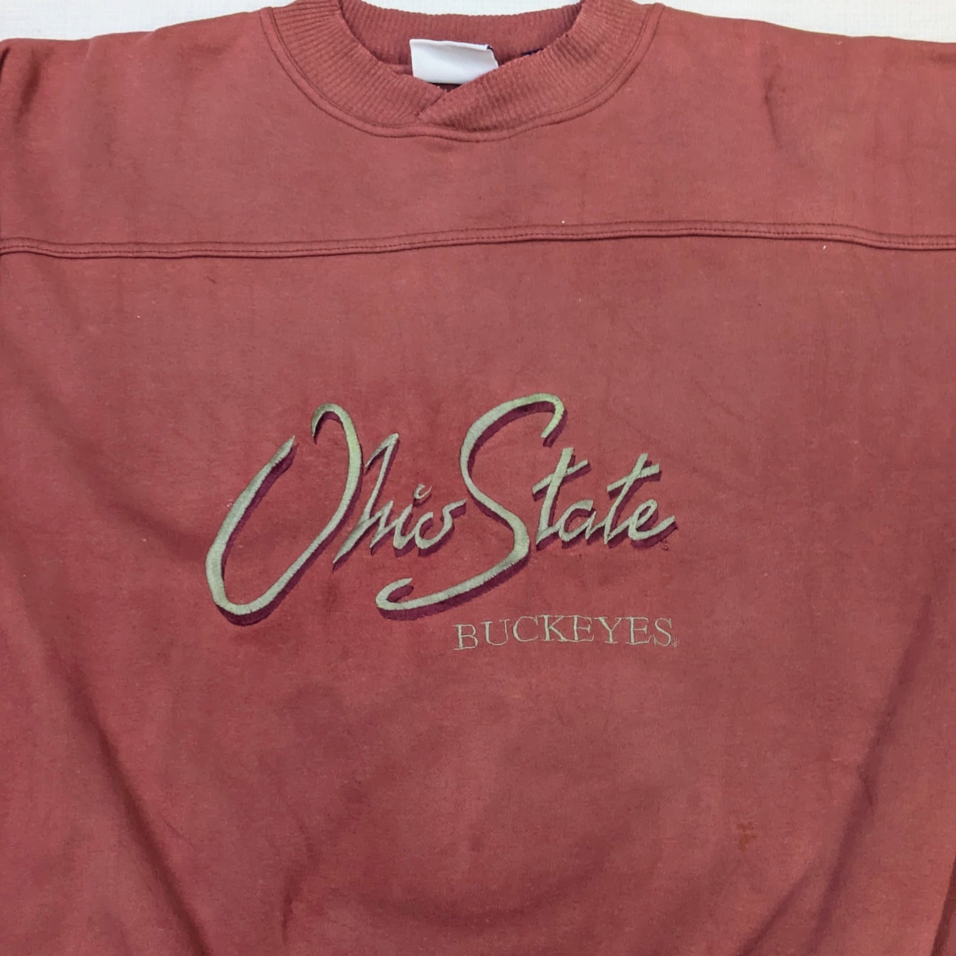 Show off your Ohio State pride with this vintage 80s crewneck sweatshirt. In classic red and white, it's perfect for game day or everyday wear. While it may show some signs of wear, it's still in good vintage condition. Don't wait, add this unique piece to your wardrobe today!